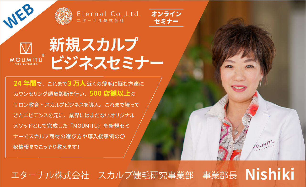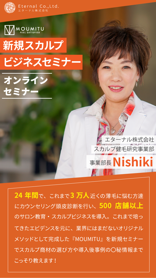 | 内容 | ◆スカルプ市場・薄毛のニーズについて ◆MOUMITU商材・技術の効果性について ◆現場で『効果をみせるサービス』について ◆自社が考える毛密エステ®とは?自信を持ってお客様にお伝えできる理由ついて ◆サロン導入に伴い導入店の事例・売上の推移、 ◆メニューの価格帯、施術時間、施術内容、ランニングコストについて |